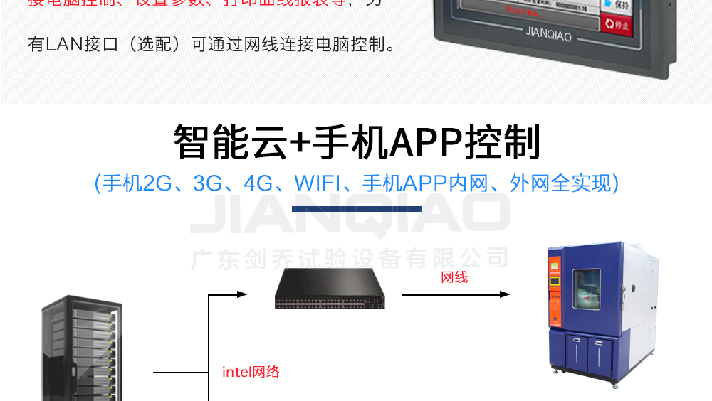 用途:廣東劍喬新款-高低溫交變濕熱試驗箱(簡稱:恒溫恒濕試驗箱),主要用來測試各種材料耐熱、耐寒、耐干、耐濕的性能。本機采用中英俄文顯示彩色觸控式屏幕畫面,操作簡單,程序