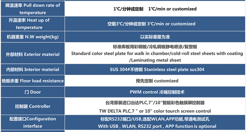 用途:步入式恒溫恒濕試驗室可為汽車、大型部件、大尺寸半成品和成品模擬特定的環境條件。如樣品評估、研發測試生產測試,加速壓力測試,可靠性測試,故障分析,以及其他需要環境模