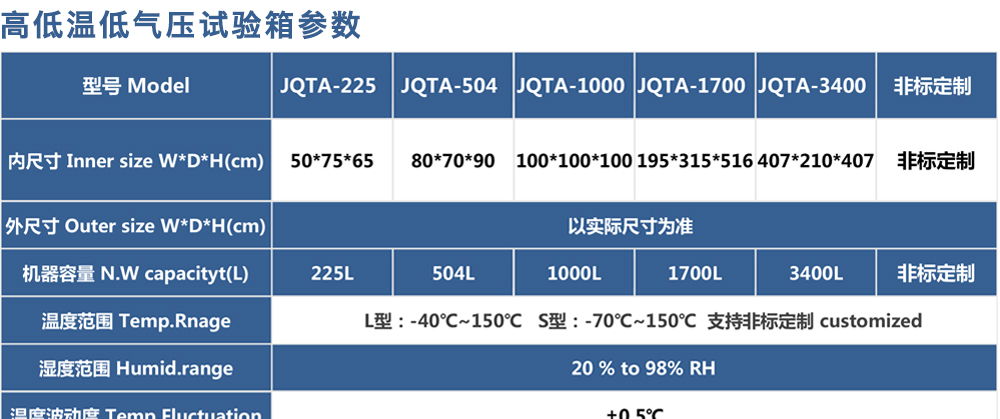 產品型號:JQTA-504 品牌:劍 喬 用途:高低溫低氣壓試驗箱,簡稱低氣壓試驗機、低氣壓(高度)試驗箱、高低溫濕熱低氣壓試驗箱,適用于電工、電子產品及其他產品、零部件及材料進行低氣壓試驗的環境試驗箱設備,可滿足電工咨詢熱線:13829135130