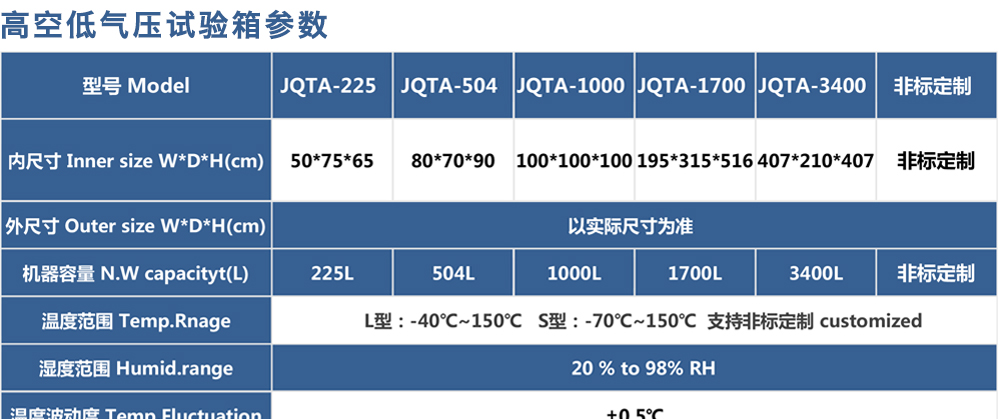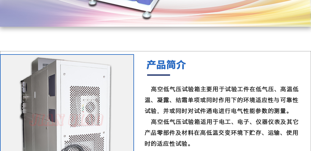 用途:高空低氣壓試驗箱主要用于試驗工件在低氣壓、高溫低溫、凝露、結霜單項或同時作用下的環境適應性與可靠性試驗,并或同時對試件通電進行電氣性能參數的測量。高空低氣壓試驗箱