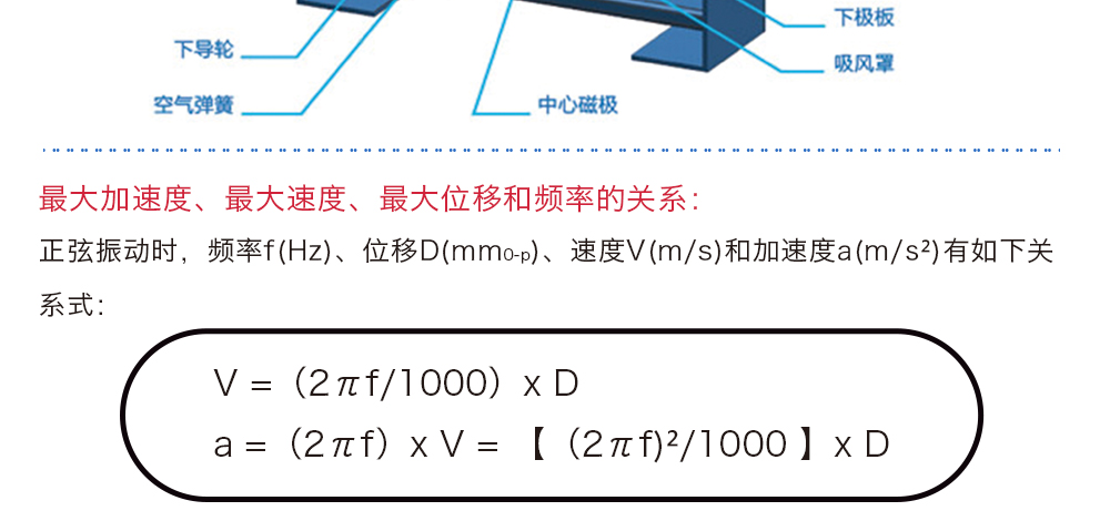 用途:正弦振動(dòng)時(shí),頻率f(Hz)、位移D(mm0-p)、速度V(m/s)和加速度a(m/s2)有如下關(guān)系式: