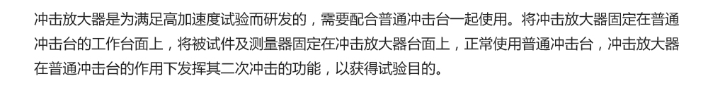用途:沖擊放大器是為滿足高加速度試驗而研發的,需要配合普通沖擊臺一起使用。